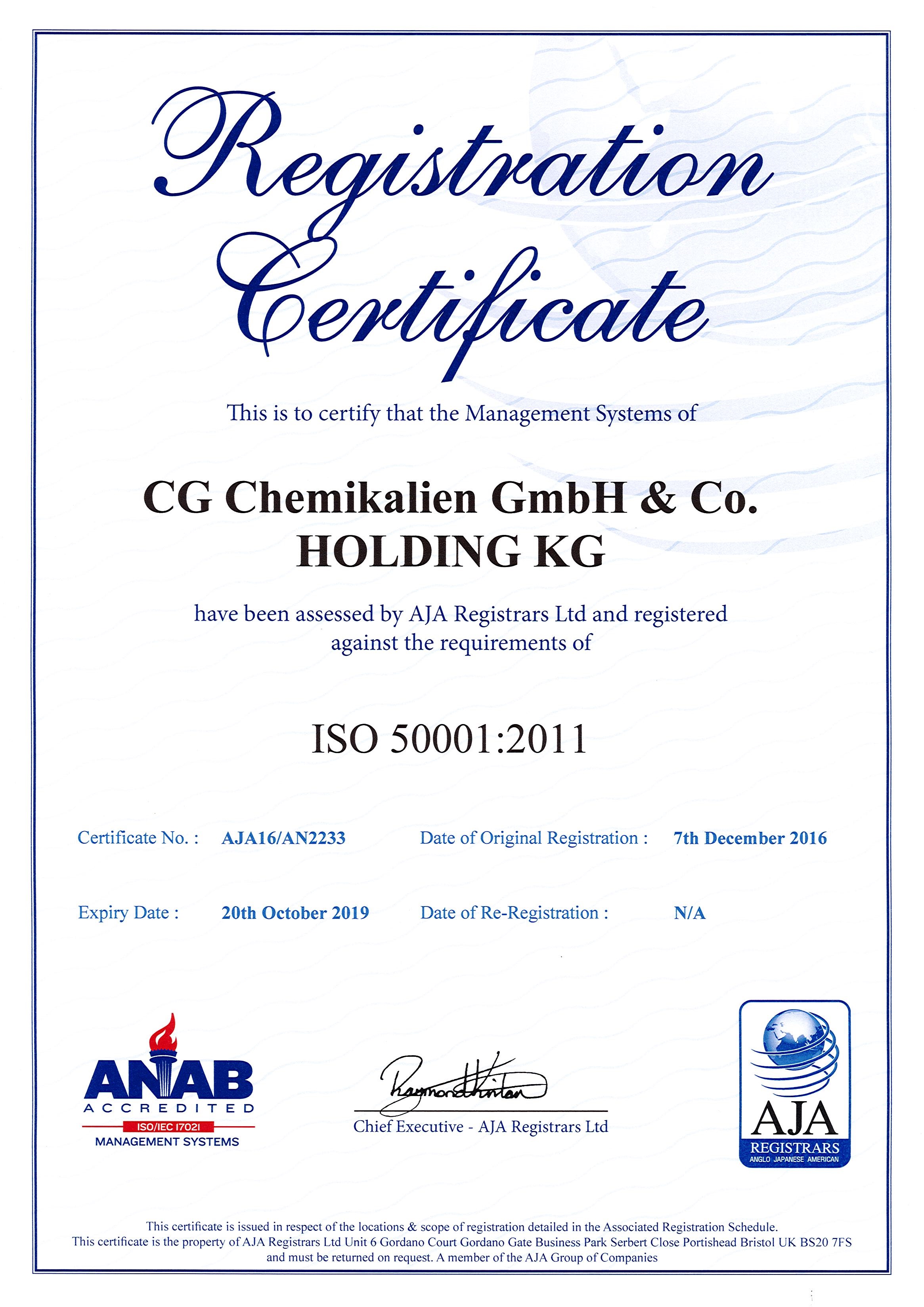 Der Erfolg von CG Chemikalien basiert darauf, dass wir uns höchsten Ansprüchen verpflichtet fühlen. Um diesen gerecht zu werden, lassen wir uns regelmäßig überprüfen. Diese Zertifikate, auf die wir sehr stolz sind, stehen zum Download bereit.